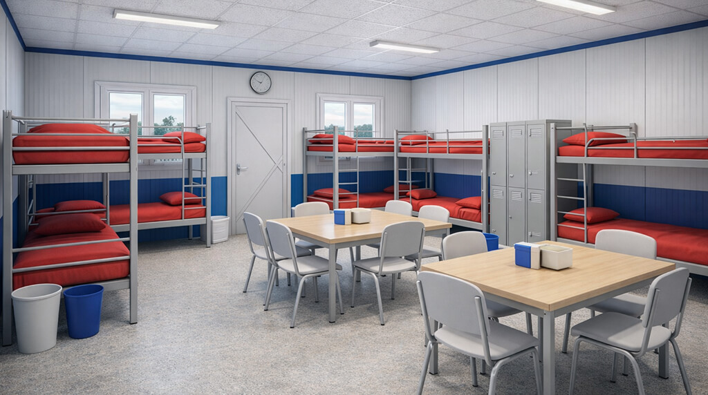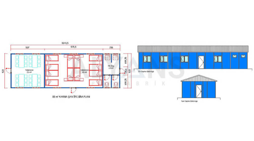 Prefabrik yatakhaneler: Çok sayıda işçinin aynı anda kullanabileceği prefabrik yatakhaneler, tek veya çift katlı olarak tasarlanabilir. Şantiyelerde rahatlıkla kullanılabilen bu yapılar, çalışanlara ve misafirlere sıcak bir konaklama sunar. Müşteri isteğine bağlı olarak tuvalet ve depo gibi ek odalarla birlikte üretilebilen prefabrik yatakhanelerin mümkün olduğunca çok kişiye aynı anda kalacak yer sunması hedeflenir.