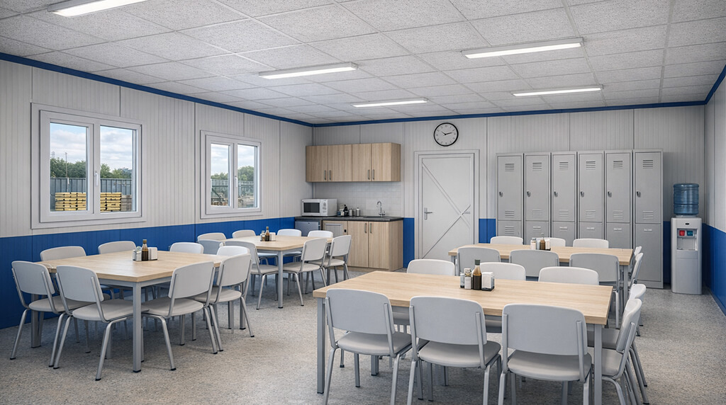 Prefabrik kafeteryalar: Biraz ortam değişikliği her zaman gereklidir. İşçiler, boş vakitlerinin çoğunu yemekhanede veya dinlenme alanlarında geçirmeyi tercih eder. Ancak insanlar zaman zaman farklı bir şeyler yemek veya daha ferah bir ortamda vakit geçirmek isteyebilir. İşçilerin dinlenmek ve vakit geçirmek için kullanabileceği prefabrik kafeteryalar, yemekhanelerin yanına alternatif olarak yerleştirilebilir. Bu yapılar, istendiği takdirde tuvalet ünitesi ve mutfak ile birlikte de imal edilebilir.